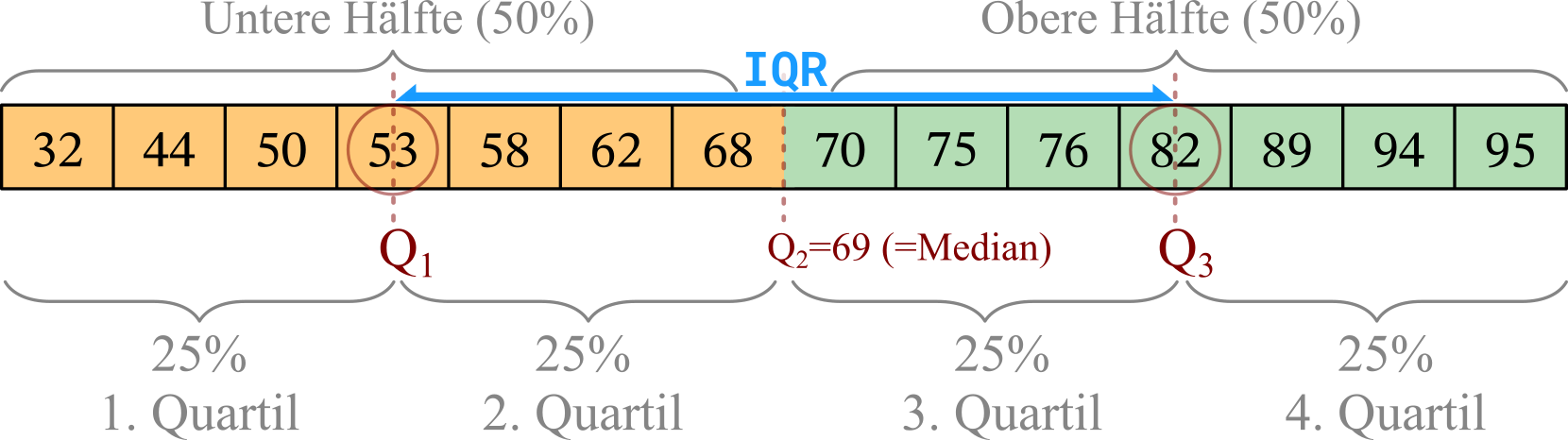 | Interquartilsabstand | ▪ Auf kein bestimmtes Lagemaß bezogen ▪ Jedoch ähnliches Prinzip wie der Median und häufig im Zusammenhang mit diesem angegeben ▪ Robust gegenüber Ausreißern & sinnvoll bei schiefen Verteilungen |