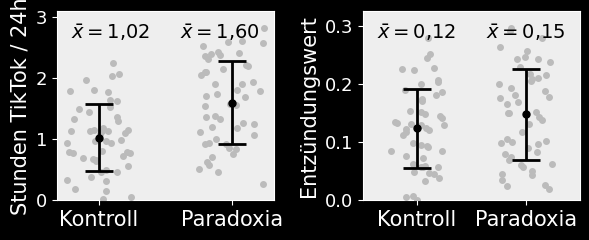 Aus den Werten und der Abbildung wird ersichtlich: tatsächlich sind auch die Entzündungswerte bei Paradoxikern erhöht! Auf Basis der Mittelwerte finden Sie also Evidenz für beide Hypothesen!