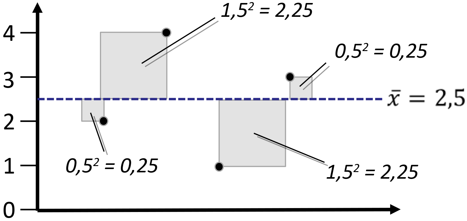 \[ \begin{aligned} \sigma^2 &= \frac{1}{4}\left(0{,}25+2{,}25+0{,}25+2{,}25\right) \\ &= \frac{1}{4}\cdot5=1{,}25 \end{aligned} \]
